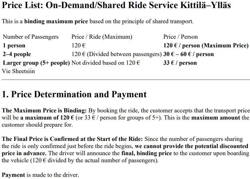 The transport is ONLY for passengers arriving or departing by flight. The reservation must be made at least 20 hours before the flight lands in Kittilä/Departs from Kittilä.