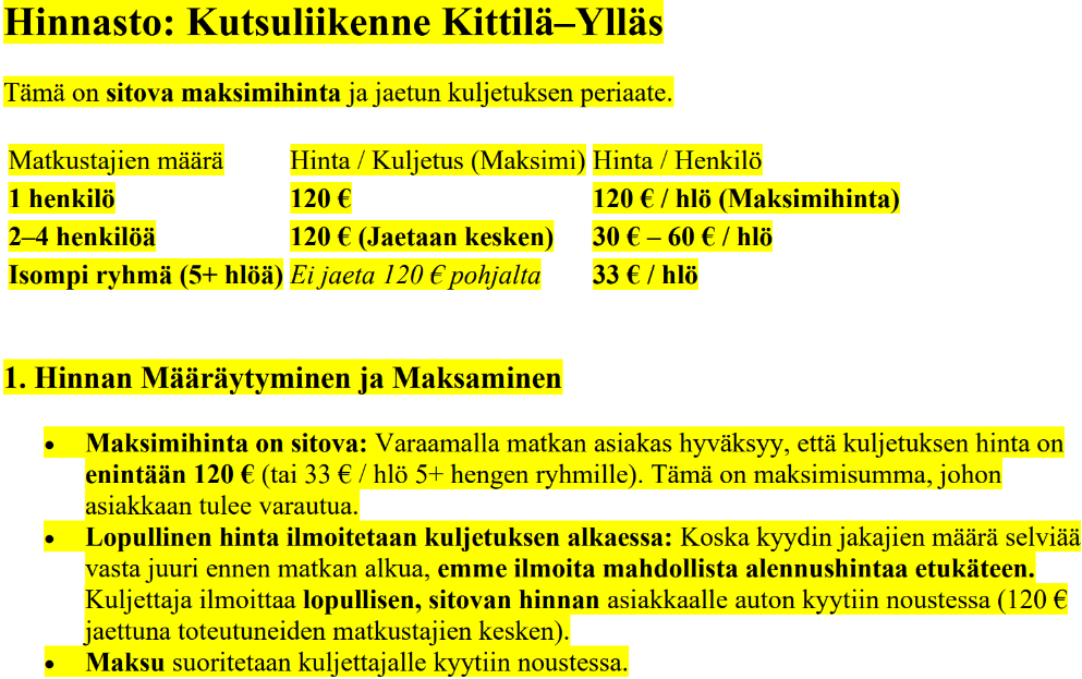Kuljetus on tarkoitettu VAIN lennolla tuleville ja lähteville matkustajille. Varaus on tehtävä 20 h ennen lennon laskeutumista Kittilään/Lähtöä Kittilästä.